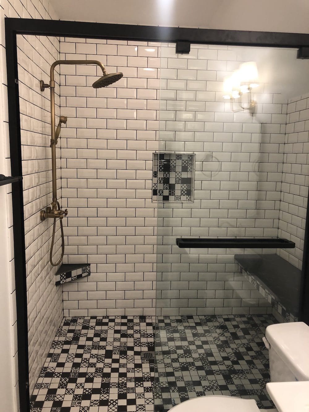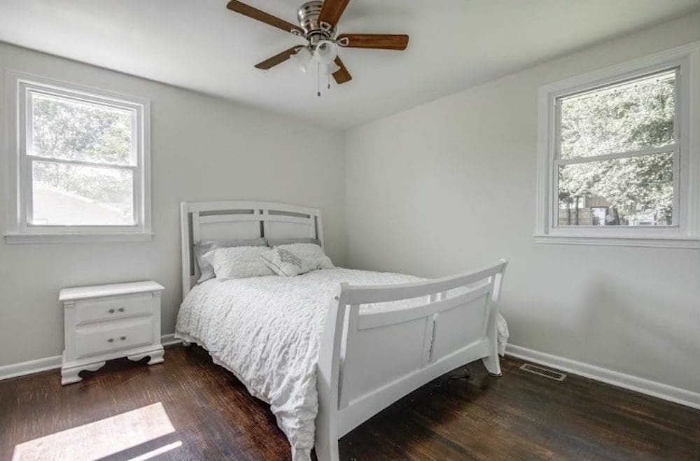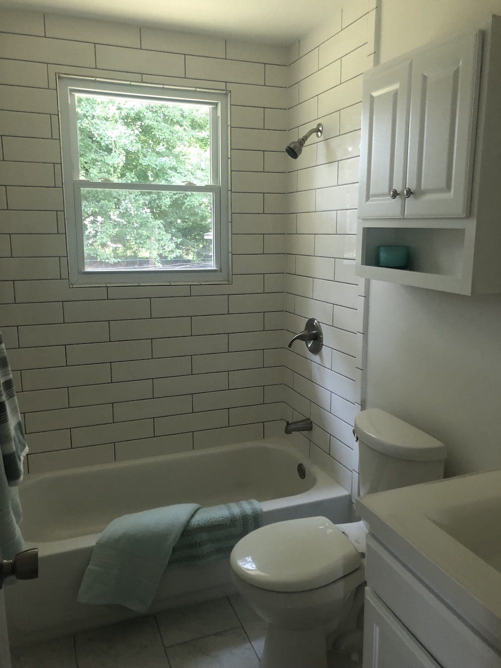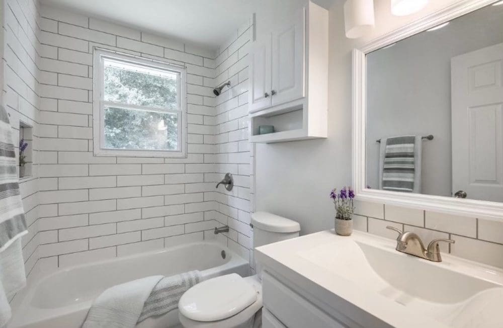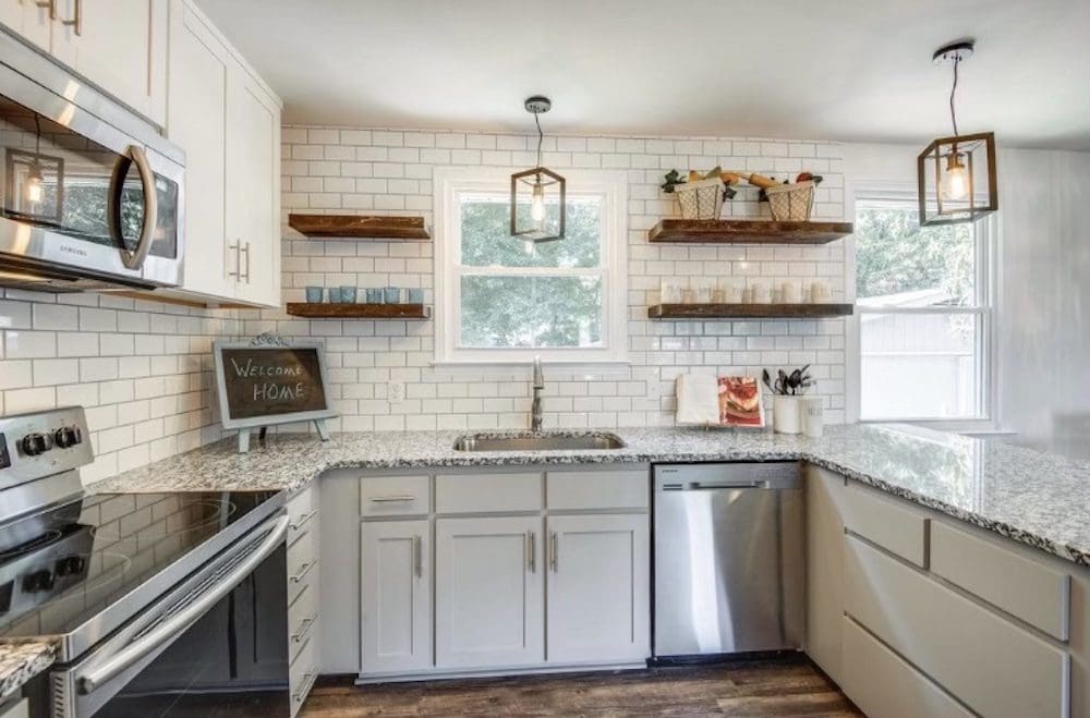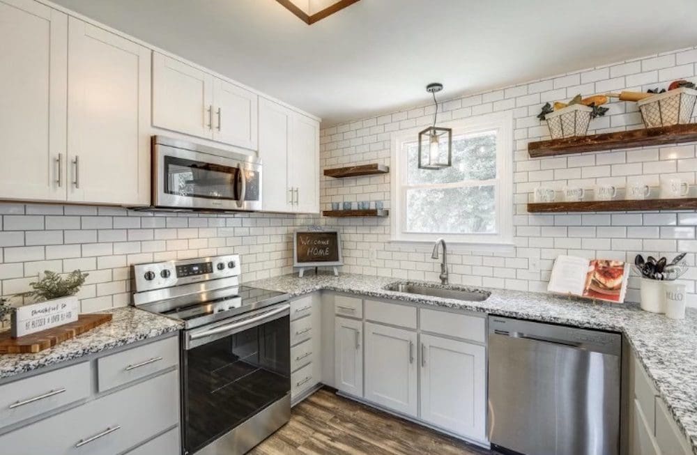Our team revitalized the kitchen with durable granite countertops and modern stainless steel appliances, including a sleek oven and microwave. Fresh white cabinets with contemporary hardware offer a clean look, while rustic wooden open shelves provide a charming way to display kitchen essentials. The classic white subway tile backsplash ties everything together with a timeless appeal.